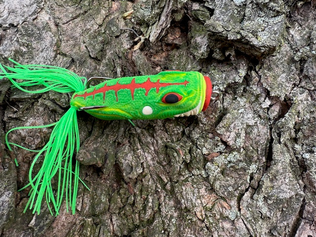 This green hydrapop topwater lure measures 5 inch, making it an ideal size for attracting attention from a wide range of fish. It's realistic design and high-quality construction make it a must-have for any angler looking to reel in a big catch. Perfect for freshwater fishing.